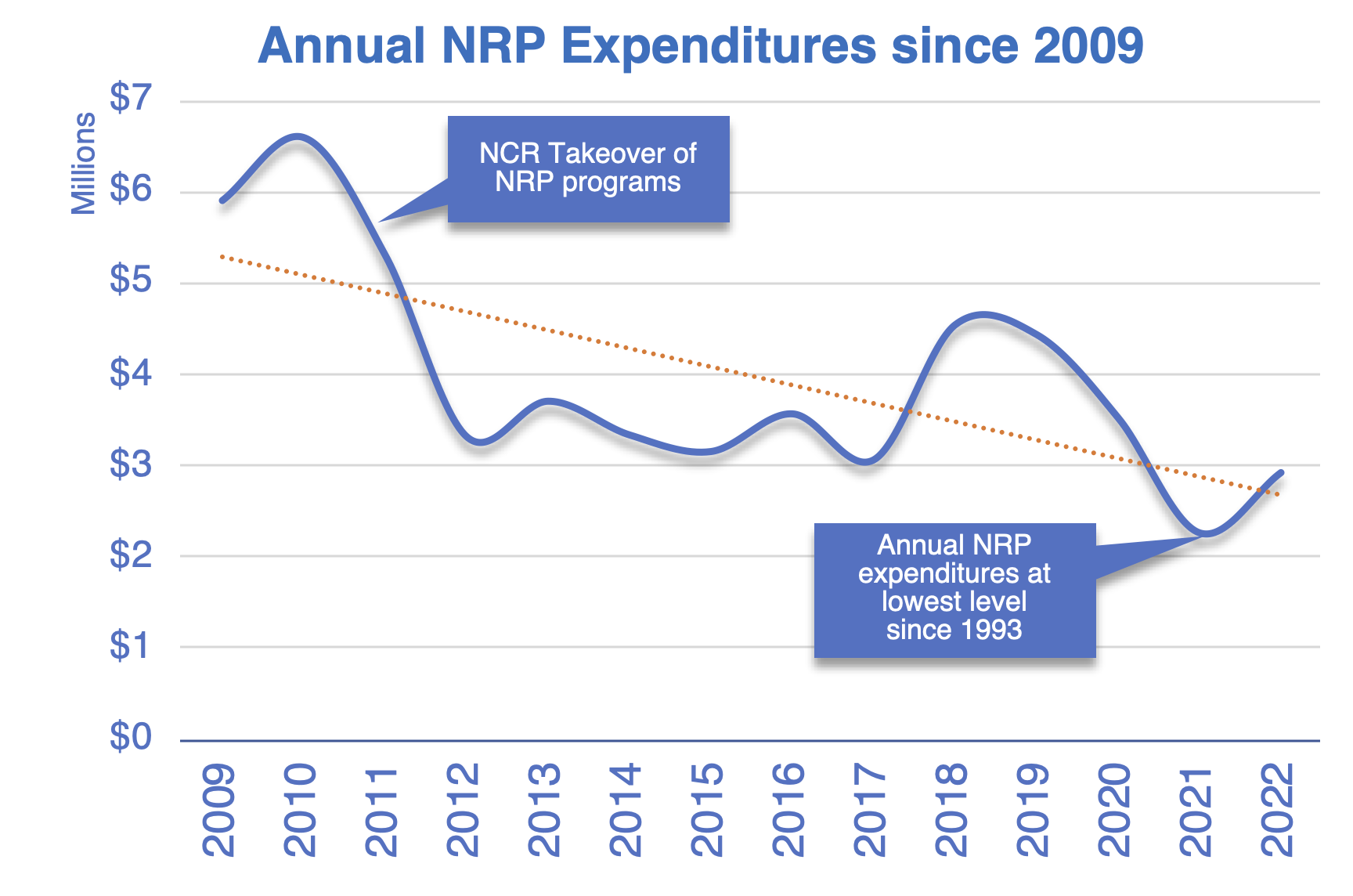 - In the five years before NCR took over NRP, annual NRP expenditures averaged $6.4 million per year.
